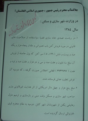 برای مطالعه ی موارد ديگر اختلاس و سوء استفاده و فريب و همچنين غصب زمين در سال 1384، به گزارش اين رسايت به بخش " کابل پرس افشا می کند" و زيربخش " گزارش سال 1384 رياست مستقل مبارزه با فساد و ارتشای اداری" مراجعه کنيد.