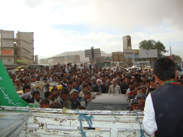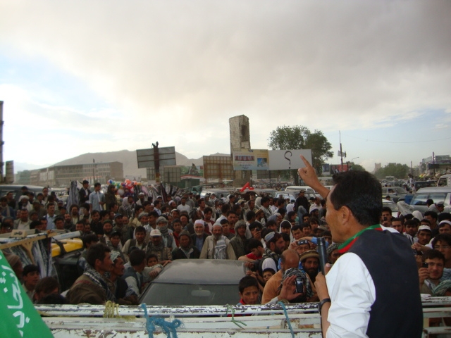 اگر میخواهید از آتش جنگ و بدبختی نجات یابید به این فرزند وطن از قوم رنج کشیده ی هزاره رای دهید که درد شما را با تمام پوست و گوشت درک کرده است و از جانب دیگر میداند که عدالت اسلامی و مساوات در پیشگاه قانون اساسی یعنی چه؟