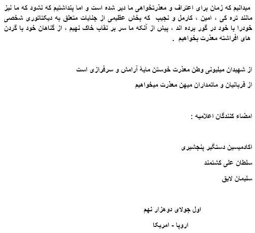 من نه خلقی و نه پرچمی هستم و نه مجاهد . ولی یک مسلمان هستم و جنین نظر دارم که کثافتی که از دست این به اصطلاح مجاهین سر زد روی تمام کمونیست ها شسته شد پس حلا ضرورت به به عفوه خواستن از مردم نباشند جز از خداوند پاک .