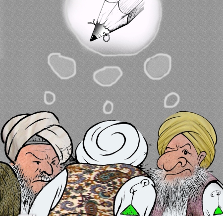 فکر میکنم ازین اگر واضح تر شود دیگه کاریکاتور نمیشه.این طرح خیلی زیبا بیان میکنه که آخند های نفهم که مغازه بنام (شورای علما)را افتتاح کرده از هر چه قلم و قلمدارو قلمچی است ترس داره خو باید هم بترسه زیرا اگر روشن فکران جامعه به میدان باشه نان آخند قات یعنی قطع میشود جانم.آخند ها از قلم به مثابه موشک و راکت هراس داره گلم.دیگه خواهش میکنم این متاع نفهمیدن خود را برخ ما بیچارا نکشین ترا خدا ! - بختیاری صاحب همیشه باشی و زنده باشی