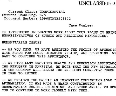 با تکیه به آنچه که نوشته شد، خوب است نظری بیندازیم به یک سندی (1 ) که از طرف وزارت خارجه امریکا درست چند روز بعد از اشغال کابل توسط طالبان به سفارت امریکا در اسلام آباد ارسال شده است. در این سند، که به تاریخ 27 سپتمبر 1996 یعنی زمان ریاست جمهوری آقای کلینتون نوشته شده و توسط رابین رافایل معاون وقت وزیر خارجه امریکا طبقه بندی شده است، به سفارت امریکا در اسلام آباد دستور داده شده تا راه های عملی همکاری و معامله با طالبان جستجو شود.