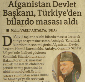 نگارنده در جریان یک پژوهش دانشگاهی در مورد رسانه های ترکی، به یک خبر بسیار کوتاه ولی درد انگیز برخوردم که در این اواخر در روزنامه حریت یکی از پر تیراژ ترین روزنامه های ترکیه به چاپ رسیده بود. هر چند این خبر شاید هم میتواند خیلی ها معمولی و طبعی باشد، ولی عمق ارزش انسانی زمامداران امروز افغانستان را نشان میدهد. در این خبر(3) که به تاریخ 27 جولای 2009، درست دو هفته قبل، در روزنامه حریت به چاپ رسیده است، آمده است که حامد کرزی رئیس جمهور افغانستان بوسیله یک شرکتِ که در انقره اموال تزینی میفروشد، از یک شرکت ِ دیگری که در شهر انتالیا ِ ترکیه برای ثروتمندان عرب و اروپایی بیلیارد میسازد، یک تخته بیلیارد ی را که با سنگ های قیمتی مزین شده است، خریده است. هر چند قیمت دقیق بیلیارد ی را که آقای کرزی خریده است، در خبر نیامده، ولی گفته شده است که قیمت یک تخته بیلیارد که با سنگ های قیمتی مزین شده باشد، از 6500 (شش هزار و پنجصد) یورو شروع میشود.