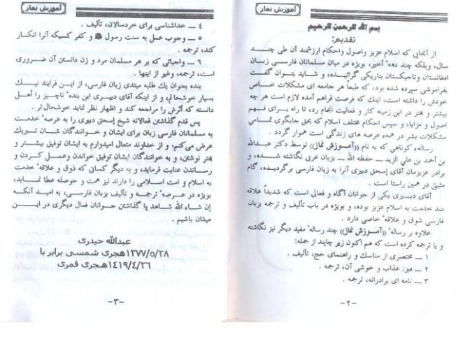 جهت معلومات برای این نویسنده محترم باید گفت که شما در سال 1377 هجری شمسی ) موفق شده اید که در رابطه به نماز مجموعه کو چک ایرا تحریر نمائید و اگر به کتب خانه ها ی شرقی مراجعه نمائید و یا در کو چه نعلبندی پشاوردر پاکستان و یا کو چه های کتاب فروشی شهر کابل گذر نمائید خواهید دید که کتاب بنام ( پنج گنج) تو سط شیخ عطار( شاعربزرگوار زبان فارسی دری) چند ین قرن قبل نو شته شده است که در فصل اول آن مسئله ا صول نماز و فقه به لسان فارسی به شکل شعر نگارش یافته و فعلا در مساجد و مدارس های افغانستان منحیث کتاب درسی از آن استفاده میشود و در هر خانه مو جوداست. و اگر به کتاب مثنوی معنوی مولانای روم که سگو نت اصلی آن بلخ ( در شمال افغانستان) است و سال 2007 از جانب اداره سازمان یو نسکو بنام وی مسمی گردیده است مراجعه نمائید ترجمه و تفسیری از قسمت های قران عظیم الشان را به زبان شیرین و گویای فارسی مشاهده خواهید نمود. باز هم اگر دقت شود یک تعداد کتب زیادی است که درین اواخر تو سط فارسی زبانان ازعربی بفارسی تر جمعه شده ا ست مانند فقه آسان، شرح قدوری و غیره که عمومآ تو سط گوینده گان زبان فارسی تحریر ومطالعه میگردد. از جانب دیگر امام ابو حنیفه ( رح) که باشنده اصلی افغانستان بود(در شمال کابل) در منطقه فارسی زبانان