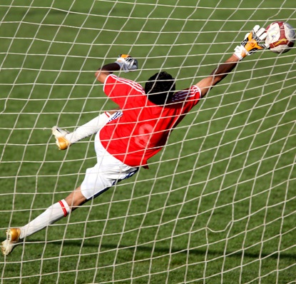 دروازه بان در حال کوشش برای رسيدن به توپ