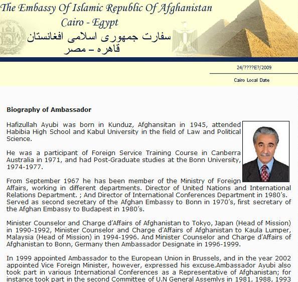 ابتدا ما در مورد سفیر جدید خیلی خوش بین بودیم چون خیال می کردیم آدم نسبتا جوانیست و بامشکلات کشور ومردم شاید بیشتر از همه اشنا باشد اما متاسفانه با گذشت چند هفته ای خیلی زود فهمیدم که آقای حفیظ الله ایوبی بدتر از سفیر قبلی بوده و جز سفرهای خارجی خوش گذرانی و توزیع بورسیه ها به اقارب ودوستان به هیچ چیزی دیگر نمی اندیشد. آقایی ایوبی حتی حاضر نیست وقت مبارکش را صرف گفتگو با یکی از تلویزیون های مصری کندودر مورد افغانستان و مردم آنکشور برای این شبکه ها معلومات بدهد ما که در این جا دانشجو هستیم اهمیت این نوع مصاحبه هارا از جانب سفارت خیلی بوضوح حس می کنیم چون اکثرا مردم عادی مصر از سطح اگاهی کمتری خصوصا در مورد کشورمان برخوردار هستند بطور مثال بیشتر جوانان مصری تصور می کنند که اسامه بن لادن از افغانستان است ، این به نظرمن وظیفه سفارت و خصوصا سفیرافغانستان در این جاست تا باسهم گیری در مصاحبه ها برای مردم درمورد کشور و هویت مردم افغانستان معلومات بدهند ازقرار که من از یک منبع خیلی نزدیک به سفارت شنیدم چندین باز شبکه تلویزیونی خبری " نیل " تقاضای مصاحبه با آقای ایوبی را داشتند ولی جناب ایشان به بهانه های مختلف این مصاحبه را رد نموده اند.