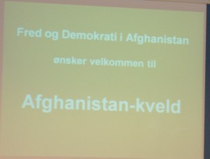 روز پنجشنبه تاریخ 03.12.09 " صلح و دموکراسی در افغانستان" جلسۀ در اوسلو پایتخت کشور نروژ با عنوان "شب افغانستان: یادو بودی از قربانیان، استراتژیی برای بازماندگان" برگزار کرده بود که در آن از نهادهای فرهنگی، سازمانهای ضد جنگ و مدافعین حقوق بشر و همچنین افراد روشن فکر و تحلیلگران سیاسی افغانی و نروژی اشتراک داشتند. این برنامه به بخشهای ذیل تقسیم بندی شده بود.