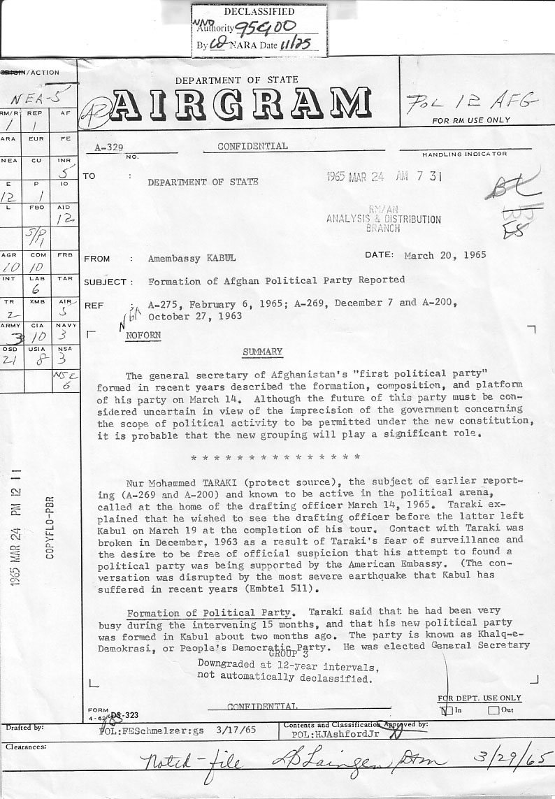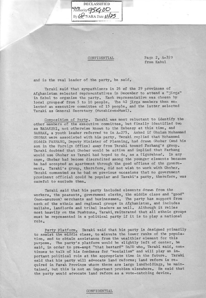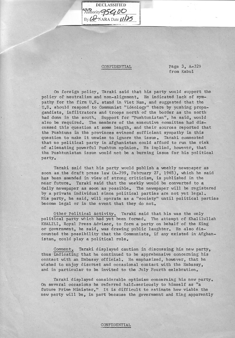 سندی (2) را که از آرشیف ملی امریکا بدست آوردم، نشانهِ دیگریست از چگونه گی آغاز و شاید هم دوام بازی بغرنج کنونی که متاسفانه مردم مان قربانیان نخستین آن هستند. این سند ایرگرام محرمی است که به تاریخ 20 مارچ 1965 از طرف سفارت امریکا در کابل به وزارت خارجه امریکا ارسال شده است. در این سند نور محمد تره کی درست مدتی بعد از تاسیس حزب نامنهاد دموکراتیک خلق به یک نمایندهِ ارشد سفارت امریکا که به گمان غالب مسول بخش استخباراتی سفارت نیز بوده است، گزارش تاسیس حزب دموکراتیک خلق را داده است. در سند از نورمحمد تره کی زیر نام "منبع تحت الحمایه" یاد شده است. باید نوشته شود که در قاموس استخبارات، "منبع" برای کسانی که از اهمیت سیاسی، اجتماعی یا اقتصادی در یک جامعه برخوردار هستند و خیلی ها مهمتر از اجنت های معمولی عمل می کنند، گفته می شود. "تحت الحمایه" بودن تره کی هم اهمیت مهم تره کی را در نزد امریکا نشان داده است. در سند آمده است که آقای تره کی از یک کارمند خاص امریکایی به تاریخ 14 مارچ 1965، قبل از اینکه این کارمند عالی رتبه امریکایی افغانستان را ترک بگوید، خواهان ملاقات شده است. در سند همچنان تذکر رفته که رابطه ی سفارت امریکا با تره کی بعد از دسمبر 1963، بنابر ترس از تعقیب شدن توسط مامورین امنیتی افغانستان، و بخاطری که دولت افغانستان مشکوک نشود که تلاش تره کی برای تاسیس یک حزب از طرف امریکا حمایت و پشتیبانی می شود، برای مدتی قطع شده بود.