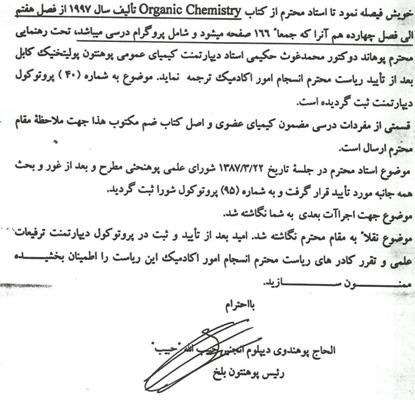 استاد عزیزی موضوعی را از کتاب Organic Chemistry تالیف سال 1997م از فصل هفتم الی فصل چهاردهم که جمعاً 166صفحه می شود وشامل پروگرام درسی می باشد باید ترجمه کند چنانچه شما درمکتوب شماره 359مورخ 26/3/1387هـ ش می بینید که مراحل آن ثبت ومورد تایید قرارگرفته