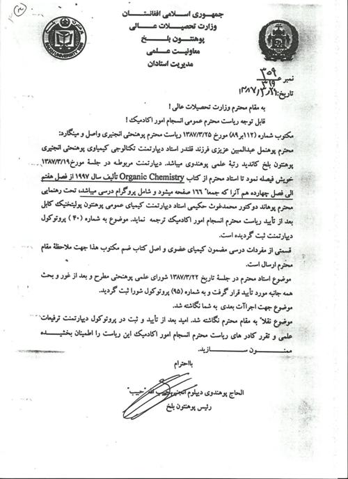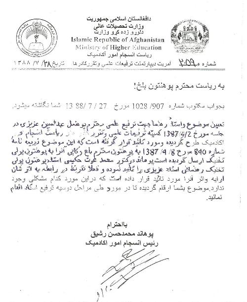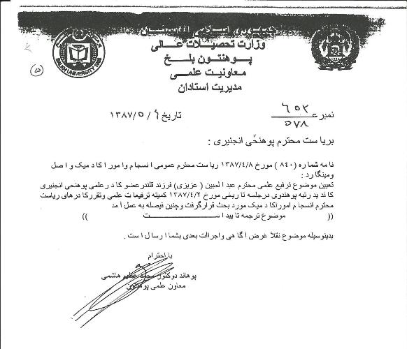 به مکتوب شماره 652-578 که ازسوی مرحوم پوهاند دکتور هاشمی به فاکولته انجنیری خبرداده شده که موضوع ترفیع علمی استاد عزیزی مورد تائید ریاست محترم انسجام وامور اکادمیک نیز قرار گرفته است