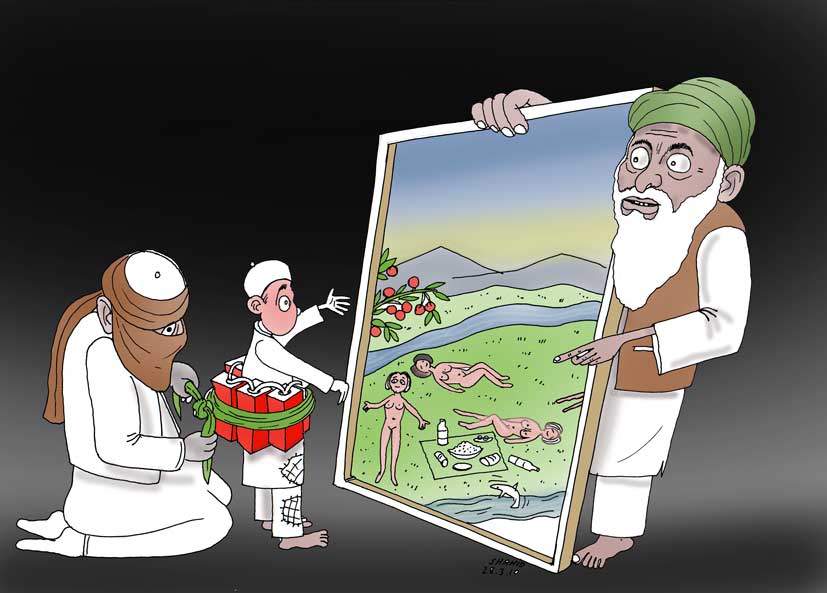اما بزنس دین برای عرب بیشرف و جاهل کودن ضروری است که زنان را همین نوکران گلبدینی و طالبی اش برایشان ببرد. و تو افغان شکم گرسنه در بین مرض و میکروب و مرگ و گرسنگی جان بکنی و تازیان پست فطرت بی همه چیز بخورند و کیف کنند.