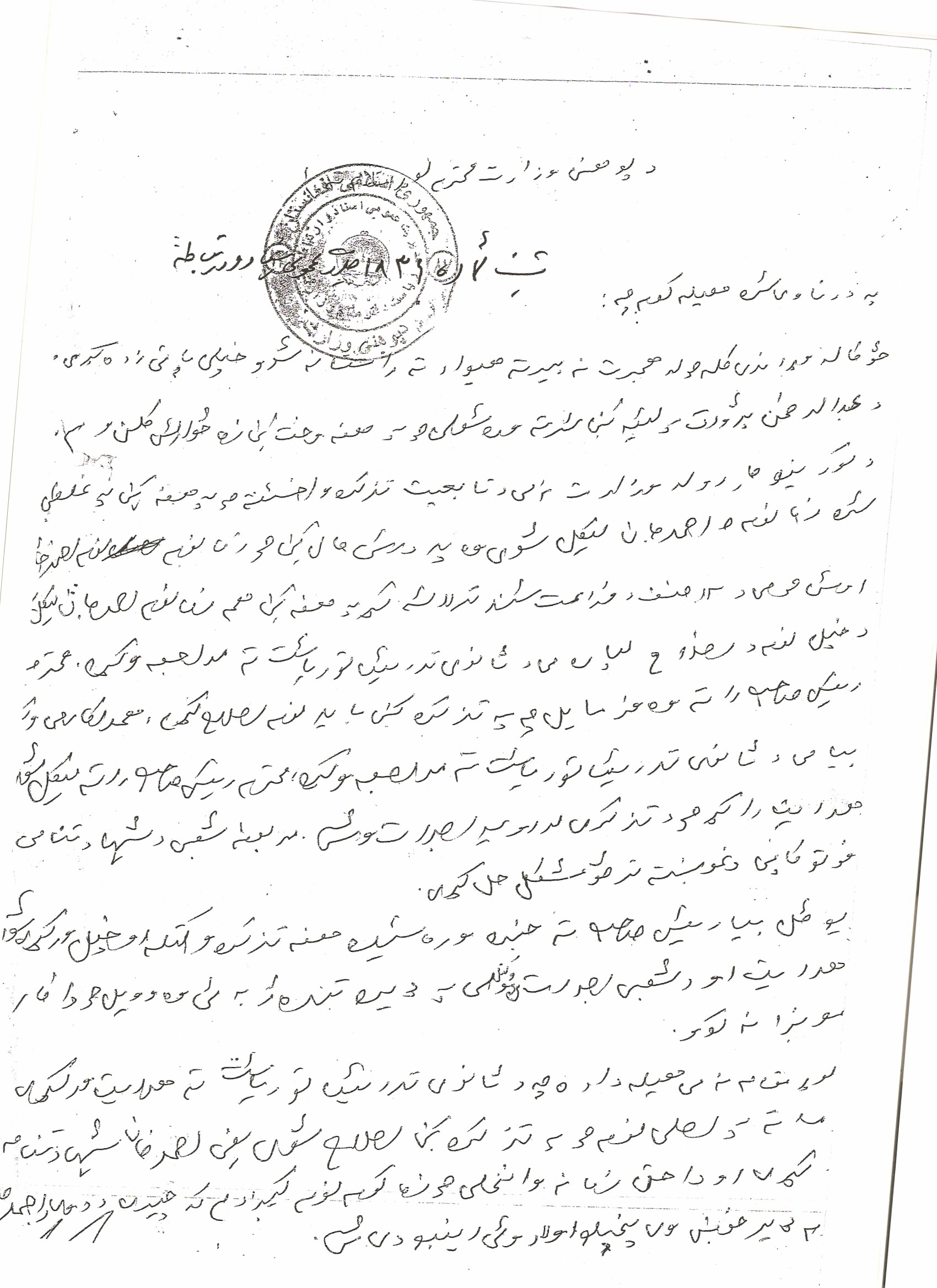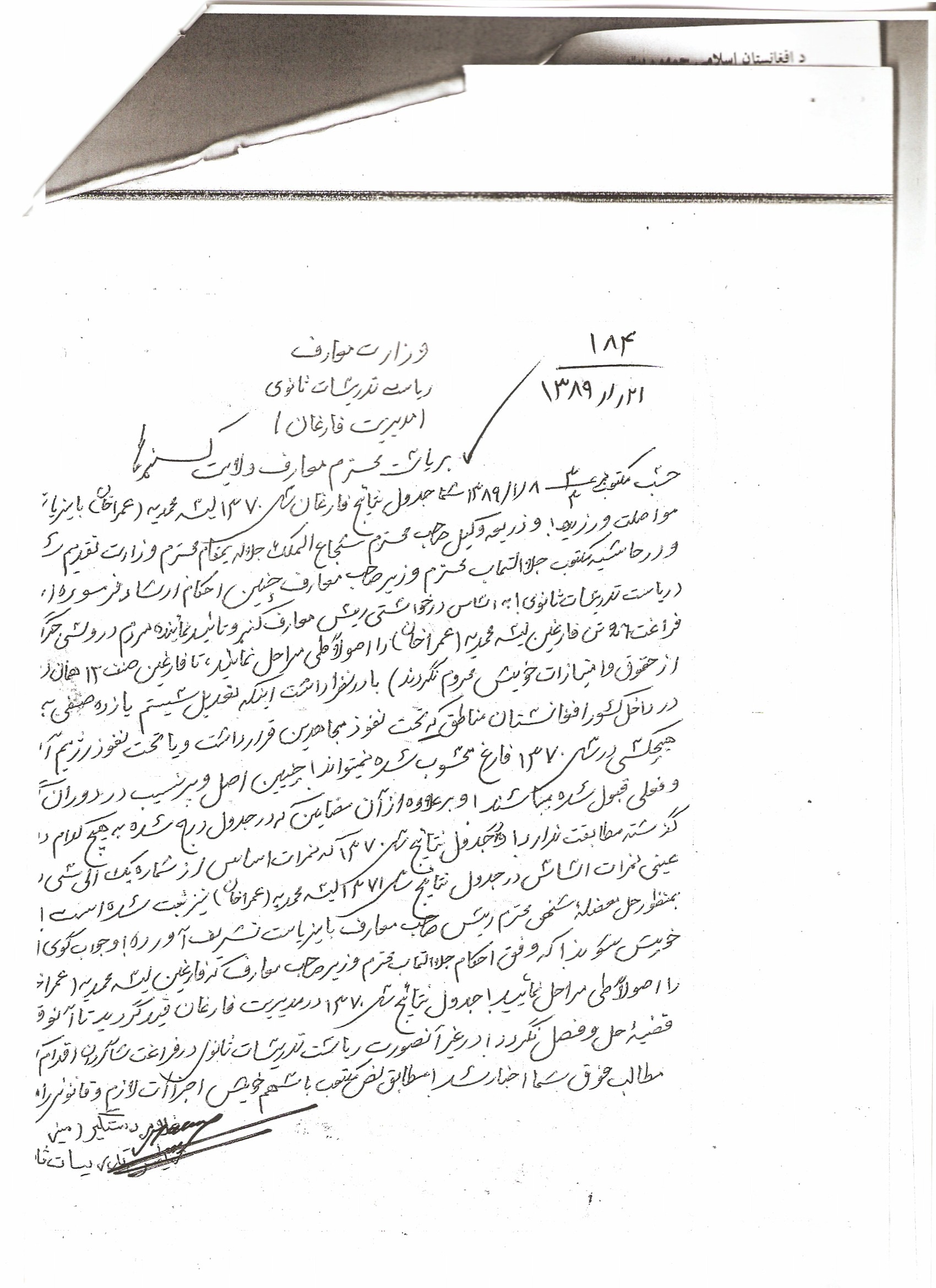 ولا که همی میرهزار ام بلا میکنه که ای اسناد وزارت معارف پیدا کده ، شفترای وزیر و رئیس هایشه میکشه . میگوفتن که : خطی دارم که کور میخانه ولی جور بزور میخانه ! مه بیچاره کمسواد (کور) که احکام نتانستوم بخانوم ای رئیسای (جور) چطو میتانن بخانن ، بلا میکنن ، بخدا که بلا میکنن !