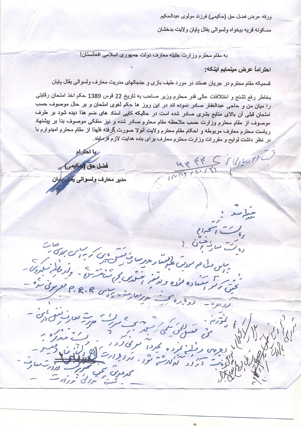 وزارت معارف ایشان را خلاف اصول، قوانین، لوایح، و مقررات معارف به تاریخ 11/07/1389 توسط ریاست معارف بدخشان مجدداً به عنوان مدیر معارف یفتل پایان، معرفی نمودند. بناً بنده ورقه ی عرض را ضمیمه ای کاپی اسناد های فوق به وزارت معارف تقدیم نمودم که وزیر معارف در حشو آن چنین حکم را صادر نمودند: ریاست منابع بشری در توظیف مدیر معارف یفتل پایان در نتیجه یک امتحان سالم در حضور داشت معین تدریسی اقدام نمایید. 22 قوس 1389 فاروق وردک وزیر معارف