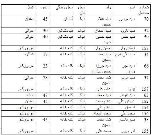 الف. (6): گرفتاری ها از قریه بید مشکین در جریان تلاشی خانه بخانه و قتل عام آنها توسط دسته قاتلین در نیک در 8 ماه جنوری.