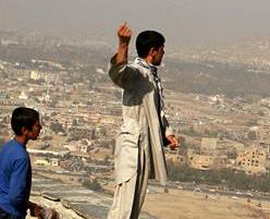 يک پسر در تپه مرنجان شهر کابل کاغذ پران بازی می کند، در روز های جمعه ورخصتی تعداد زياد از پسران دراين جا گرد هم جمع آمده و مسابقات کاغذ پران بازیرا براه می اندازند.