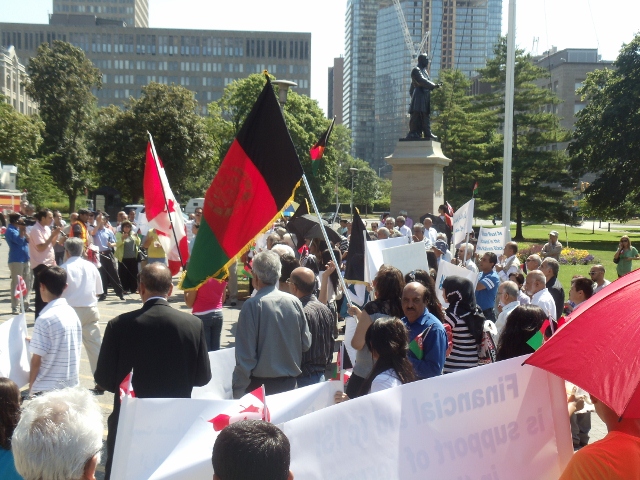 به روز شنبه نهم جولای ۲۰۱۱ میلادی صدها تن از افغانستانی های مقیم شهر تورنتو ، هملتون، کچنر، لندن و شهر های دیگر ایالت آنتاریوی کانادا علیه مداخلات دوامدار کشور های همسایه عمدتا کشور پاکستان دست به مظاهره مسالمت آمیز زدند.