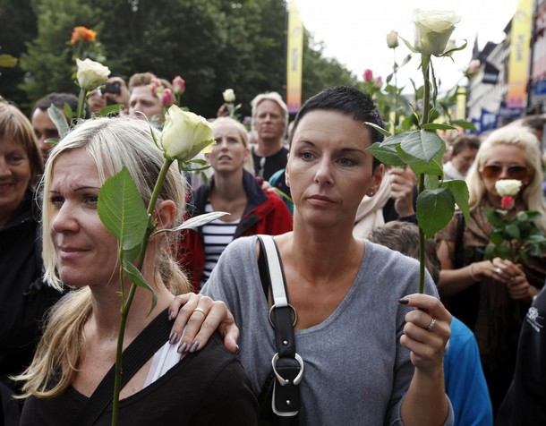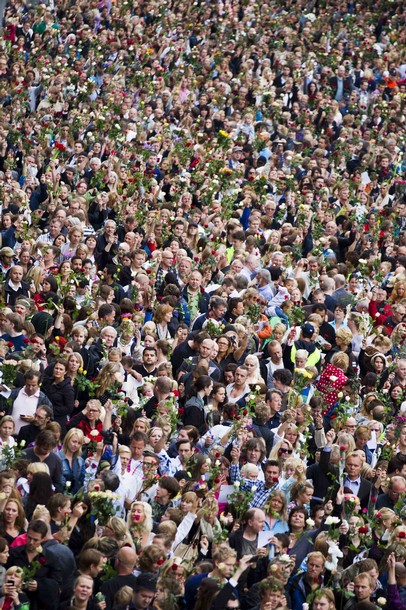 صدها هزار نروژی امروز در نقاط مختلف گرد هم آمدند و یاد ده ها تن کشته شده در روز 22 جولای را گرامی داشتند. آن ها در حالی که گل های رز در دست داشتند، آمده بودند تا بگویند دموکراسی آری، عشق آری، راسیسم نه. ینس استولتنبرگ صدر اعظم نروژ در جمع مردم گفت که نروژ از 22 جولای به بعد تلاش خاص و بیشتری برای دموکراسی خواهد کرد. شاهزاده و ولیعهد نروژ گفت که امروز خیابان های نروژ از عشق پر است. او از مردم خواست تا گل های رز را در تمام خیابان های اسلو پخش کنند. يکی دیگر از مقامات گفت که ما اینجاییم تا به نژآدپرستی نه بگوییم. دوکراسی آری نژآدپرستی و راسیسم نه. يک نویسنده ی نروژی روی دیوار فیس بوک خود نوشته که ما مردم نروژ به خیابان ها می رویم تا نشان دهیم ما همه برای حمایت از آنچه تروریست نروژی علیه آن است آماده هستیم.