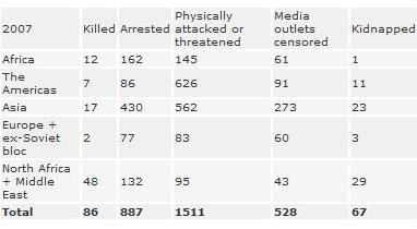 At least 86 journalists were killed around the world in 2007. The figure has risen steadily since 2002 - from 25 to 86 (+ 244%) - and is the highest since 1994, when 103 journalists were killed, nearly half of them in the Rwanda genocide, about 20 in Algeria’s civil war and a dozen in the former Yugoslavia.