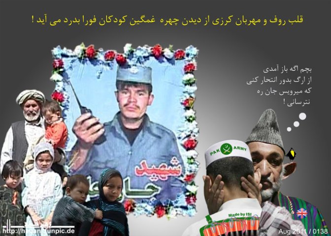 کرزی یک فاشیست به تمام معنا است که برای ای اس ای و طالبان کار میکند. لعنت بر این اولاده اوغو که ملت را به خاک عزا نشاند.
