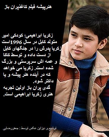 زکریا ابراهیمی( کودکی امیر): متولد کابل در سال 1996است. زکریا پدرش را در جنگهای کابل از دست داده و توسط کاکا و عمه اش سرپرستی و بزرگ شده است. زکریا می خواهد که در آینده هنر پیشه و یا داکتر شود. گدی پران باز اولین تجربه هنری زکریا است...
