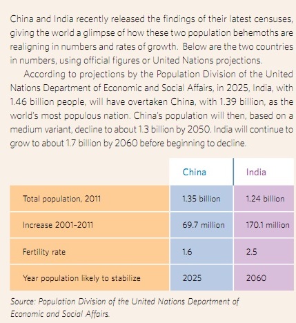 دو کشور چین و هندوستان همچنان بیشترین جمعیت جهان را دارا می باشد. طبق این گزارش جمعیت چین در سال 2011 یک اعشاریه/ کاما 35 میلیارد جمعیت دارد و هندوستان یک اعشاریه/ کاما 24 میلیارد. آمار صندوق جمعیت ملل متحد نشان می دهد رشد جمعیتی هندوستان بشتر از چین در سال 2011 بوده است.