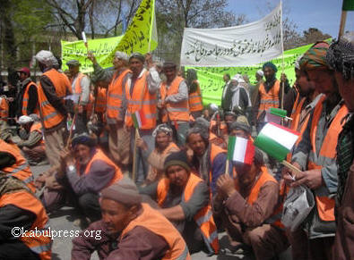 به همراه عکس هايی از يک حرکت متمدنانه و امروزی کارگران افغانستان/ يک کارگر اگر کاری باشد، با همه ی جان کندن ماهانه چيزی بيش از دو يا سه هزار افغانی درآمدی ندارد. پول کارگری حتا نمی تواند نان خشک کارگران را تامين کند تا چه رسد به موارد ديگر. در همين حال در دستگاه فاسد هستند مقاماتی که تنها معاش امتيازی آنان بيشتر از 80 برابر معاش يک کارگر و يک کارمند ساده می باشد