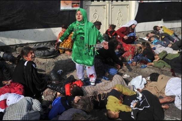 شما مردم از یک طرف خوده را به چاقو کارد و تبرچه میزنین که خون های شما بیرون بیاید تا در غم و عشق حسین خون شریک و غم شریک شوید و از طرف دیگر وقتی شما را برای رسیدن به نزد خانواده امام حسین و اهل بیت به آسان ترین طریقه یغنی بمبینگ خون الود تر از شهید های کربلاه میسازند , باز همو غالمغال تان بیرون میشود که که کافران ما را کشتنذد و کرزی چرا جلو انها را نمیگیرند . ؟ ما نفهمیدیم که شما از دروغ ده روز غاشورا خود چاقو میزنین و یا از ایرانی ها پیسه میگیرین که ایتو کونین . و الله اعلم بالصواب .