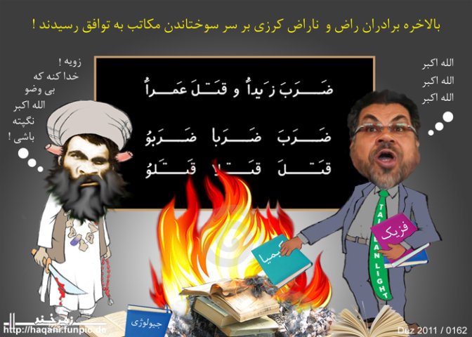 درعوض کتب درسی اسلامی چاپ بازار قصه خوانی پشاور پاکستان با مطالب و موضوعات اسلامی دیوبندی چون احکام و شرایط سنگسار زنان ، ذبح اسلامی مخالفین ، احکام بدار آویختن اطفال ، شرایط و احکام قطع اعضای بدن مخالفین و کتب مفیده دیگر در باب فواید و ثواب های فراوان از استعمال کلوخ بجای کاغذ تشناب و از نصوار بجای سیگار و از مسواک بجای برس دندان در مکاتب کشور تدریس خواهد شد.