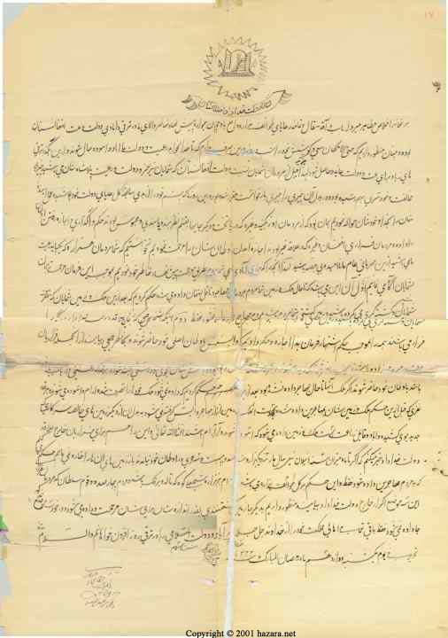 "تا حال ملک و زمین شما مردم بمردمان مهاجر وناقل افغان داده می شد. حکم کردیم که بعد ازین ملک وزمین شمایان بتصرف شمایان باشد و کشته گری می کرده باشید، زمین کشتی شما میباشد. بمردم مهاجرین داده نشود .فقط
