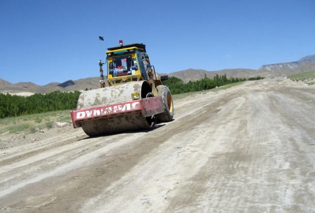 In this July 2009 photograph, an Afghan construction crew works on a planned 17.5-mile road in Ghazni province, Afghanistan, funded by the U.S. government. After three years and $4 million, only two-thirds of a mile was paved, and U.S. officials terminated the contract in October 2011.