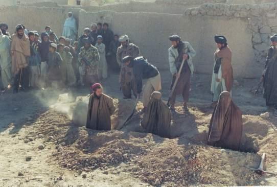در این عکس که از یک فیلم گرفته شده، جنایتکاران طالب را نشان می دهد که برای سنگسار دو زن و یک مرد آماده می شوند.